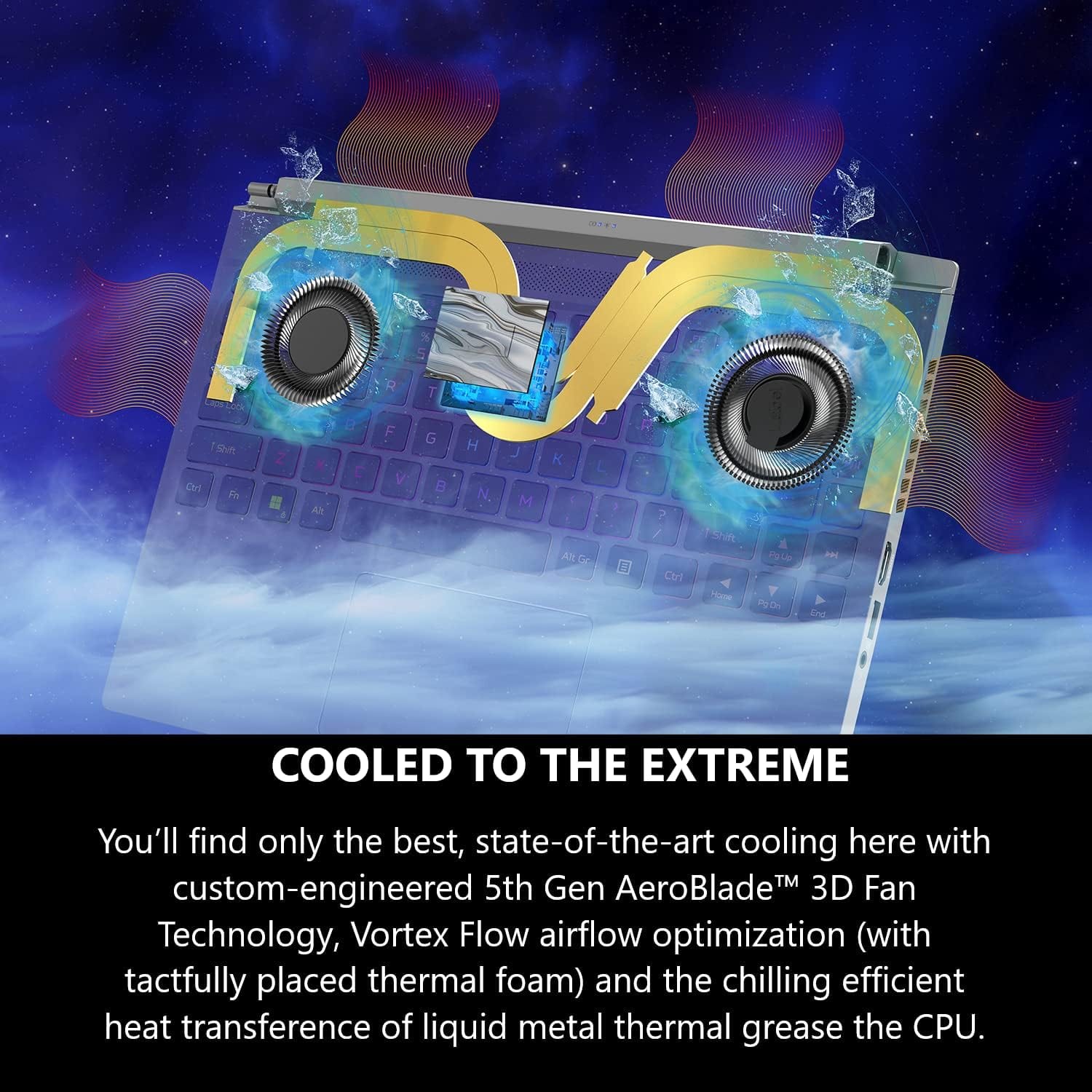 COOLED TO THE EXTREME – You’ll find only the best, state-of-the-art cooling here with custom-engineered 5th Gen AeroBlade 3D Fan Technology, Vortex Flow airflow optimization (with tactfully placed thermal foam) and the chilling efficient heat transference of liquid metal thermal grease the CPU.